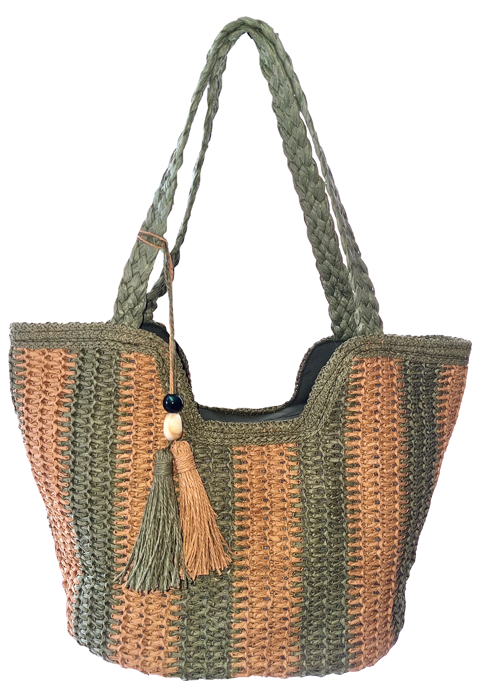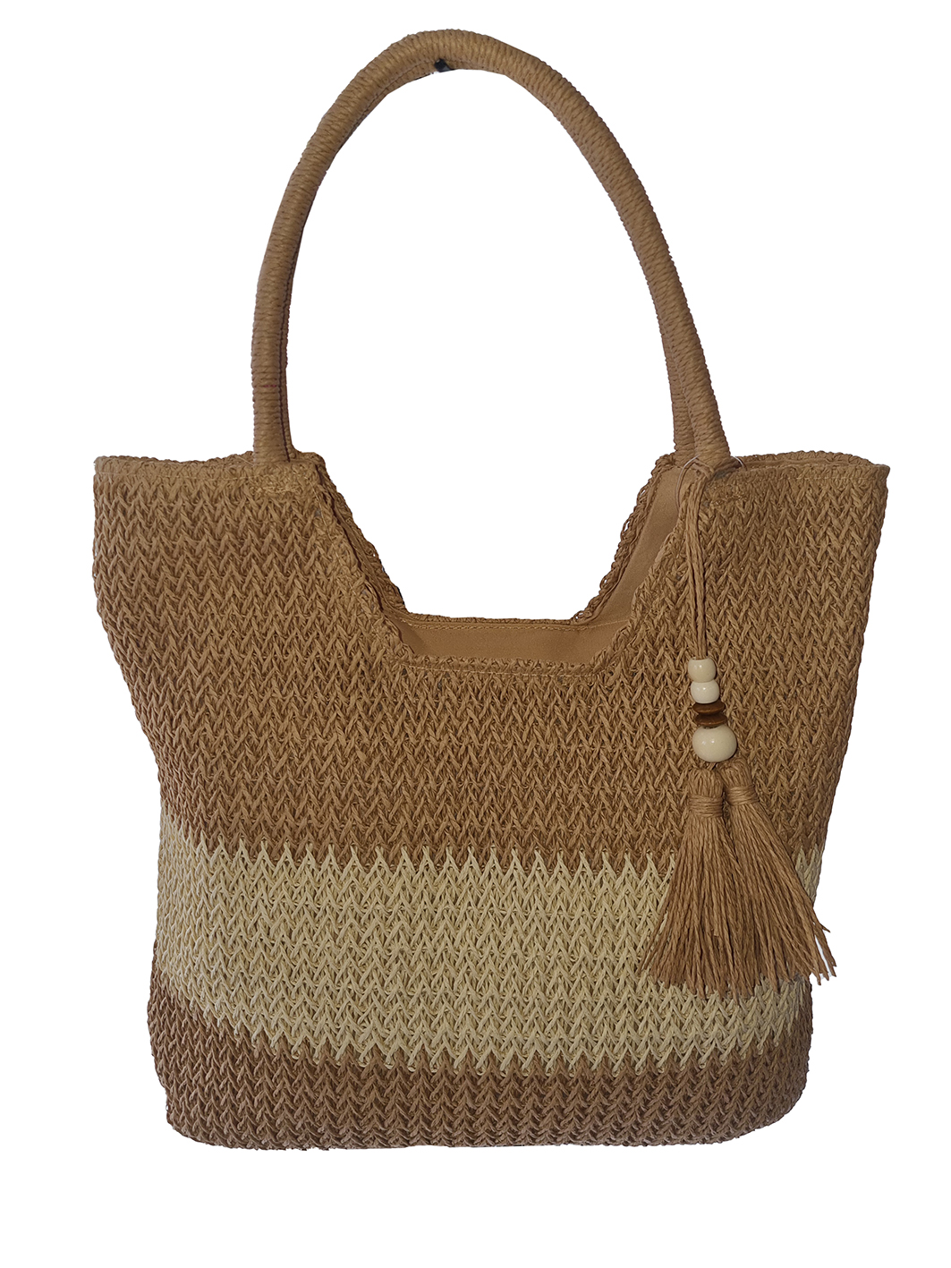 Ψάθινη τσάντα με γκρι και σομόν ρίγες. Κλείνει με φερμουάρ και περιλαμβάνει θήκη για την φύλαξη των χρημάτων, αλλά και των μικροαντικειμένων.